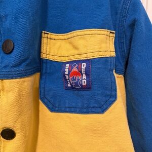 Colorblock men's jacket featuring vibrant blue, yellow, and black hues. Perfect for a bold, modern look.