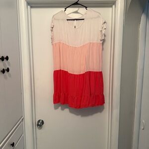 Chic and stylish colorblock mini dress featuring a blend of white, pink, and red hues. Perfect for any occasion.