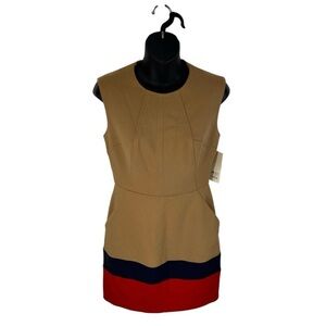 Stylish mini dress featuring a chic colorblock design in tan, navy, and red. Perfect for any occasion.