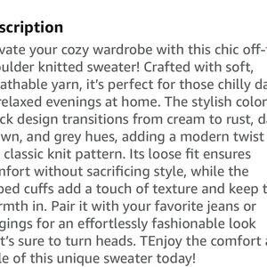 Stay cozy and stylish with this off-shoulder colorblock sweater. Featuring a blend of cream, brown, and black, it's perfect for any casual outing.