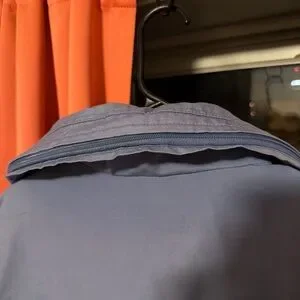 Stylish colorblock windbreaker type jacket with patchwork design and blue, green, and white panels and hidden zippered in hood