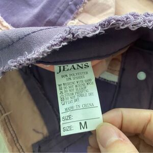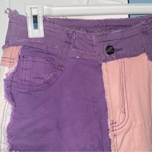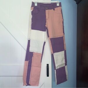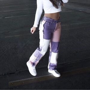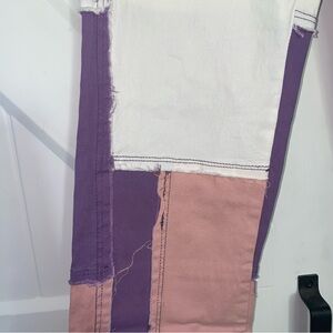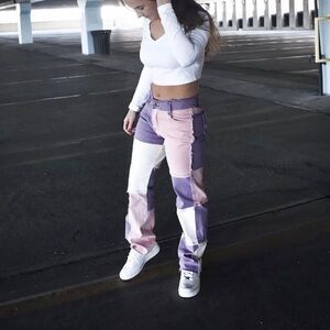 Stylish colorblock patchwork pants featuring purple, pink, and white panels. Perfect for a trendy look.