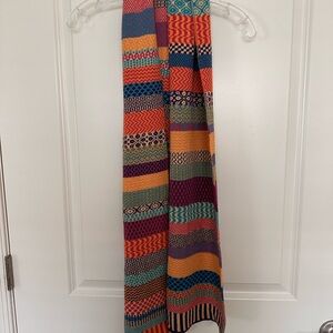 Vibrant colorblock knit scarf with geometric and wave motifs. Bright teal, magenta, mustard, navy and cream panels. Soft textured knit. Bold, playful statement piece.
