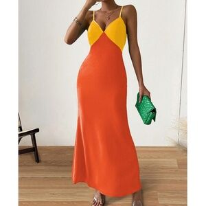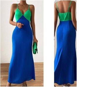 Colorblock Plunging Neck Zipper Cami Strap Slip Maxi Dress