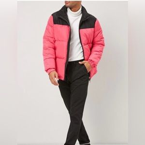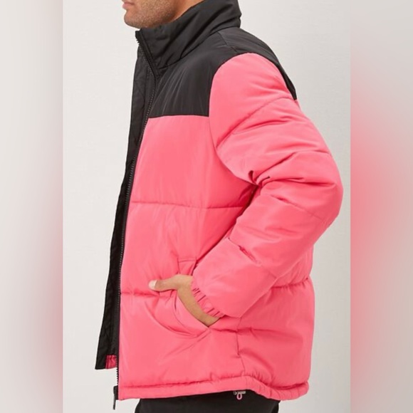 A woven puffer jacket featuring a color block yoke, zip-up front, funnel neck, long sleeve with elasticized trim, toggle drawstring hem, and a contrast woven lining.