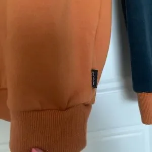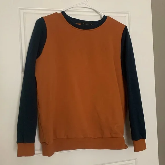 Warm sweatshirt material, colors are navy and camel.