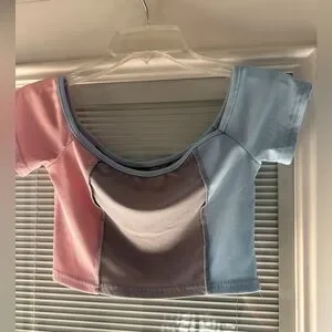 Stylish colorblock ribbed crop top with pink, gray, and blue panels. Perfect for casual outings.