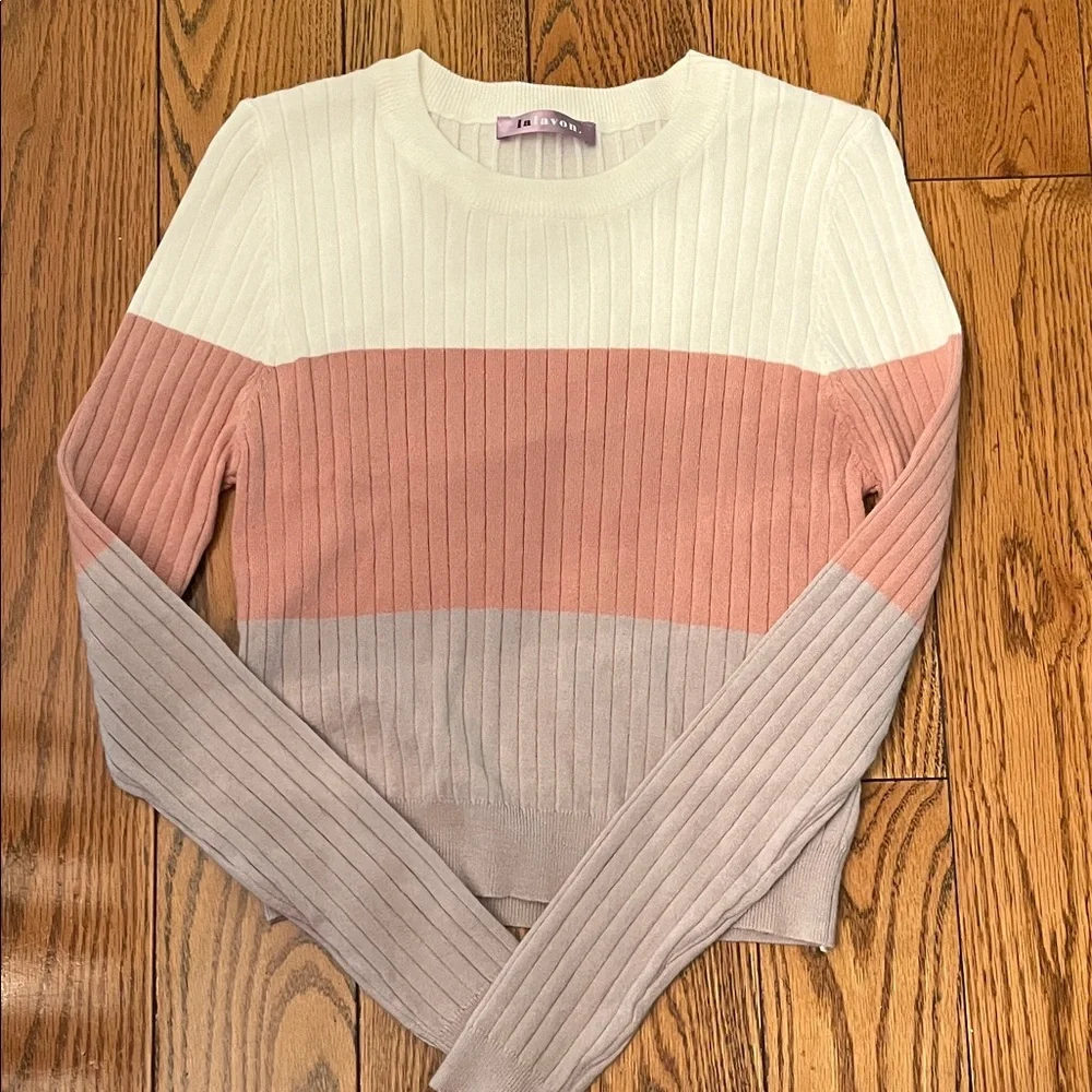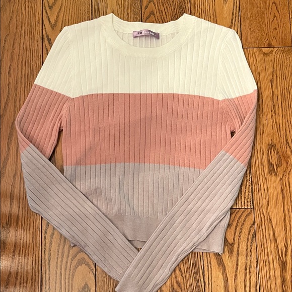 Stay cozy and stylish with this colorblock ribbed sweater. Featuring cream, pink, and tan hues, it's perfect for any casual outing.