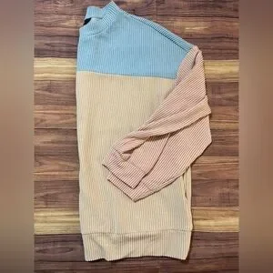 Stay cozy and stylish with this colorblock ribbed sweater. Featuring a blend of blue, cream, and pink, it's perfect for any casual outing.