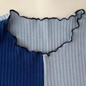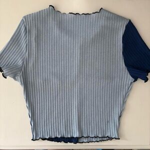 Stylish colorblock ribbed top featuring navy and light blue hues. Perfect for casual outings.