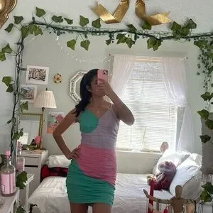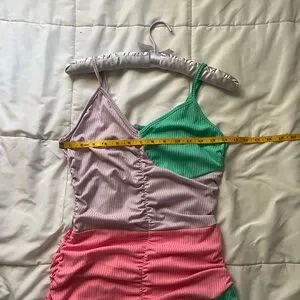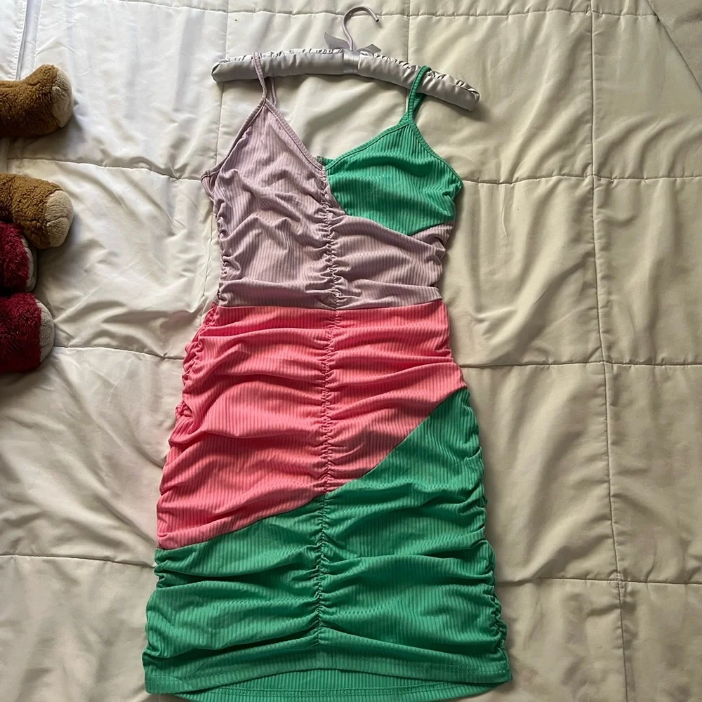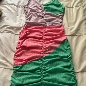 Stylish colorblock dress with ruched detailing. Features pink, green, and purple sections. Perfect for a vibrant look.