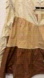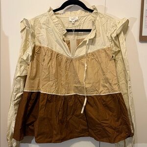 Stylish colorblock blouse with ruffle details. Features cream, tan, and brown sections.
