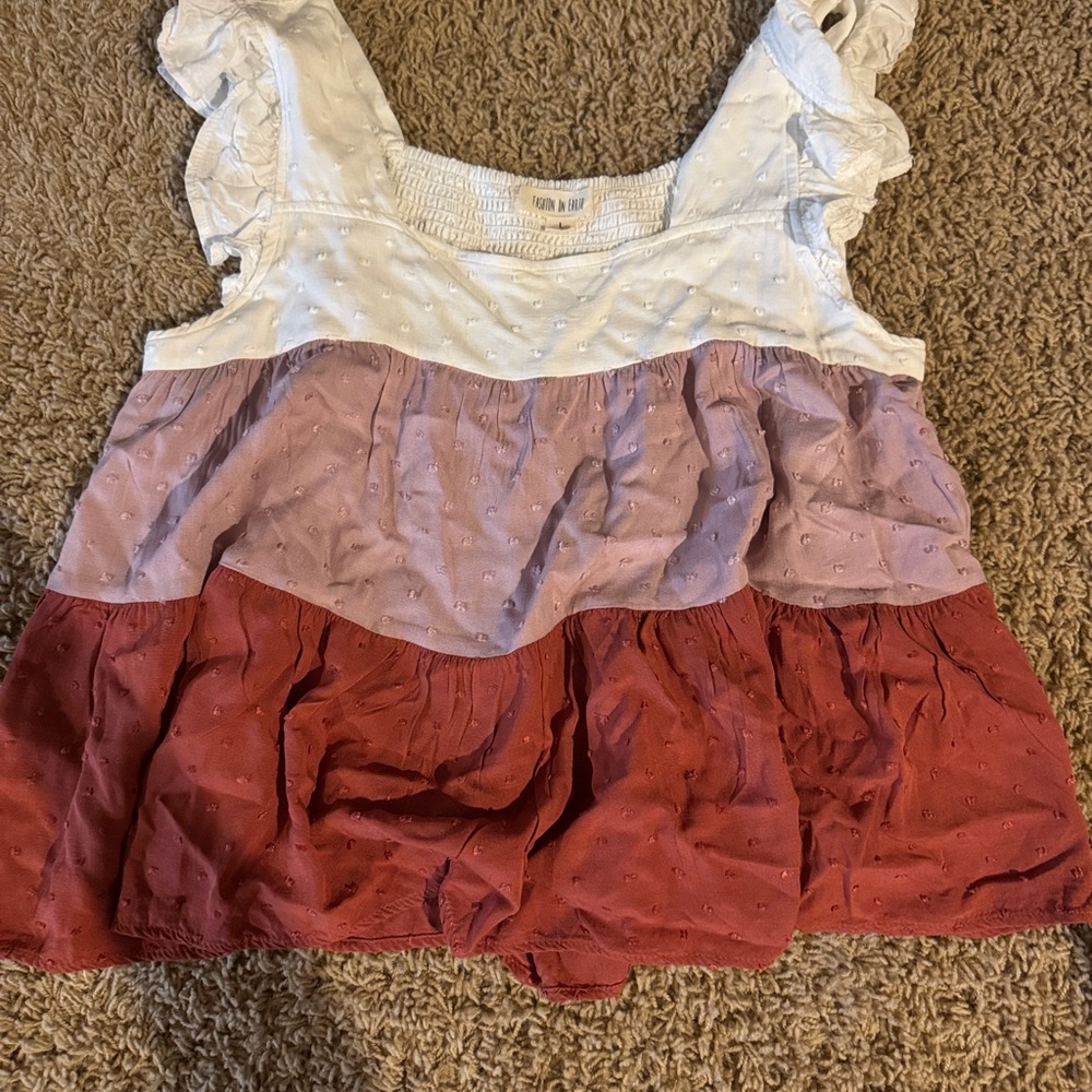 Chic colorblock top with ruffle sleeves. Features white, purple, and red tiers.