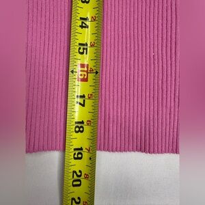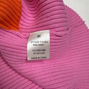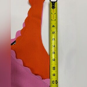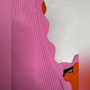 Pretty Damage ribbed knit tank with a bold pink and orange color combo and playful scalloped edges throughout. Alternating ribbed panels create a wavy, layered-look effect, even though it’s a single piece. Soft, stretchy knit with a flattering, regular tank length that hits around the belt line, not cropped. Wide straps feel secure and comfortable, and the scalloped neckline adds just the right amount of charm. Fun, bright, and very Y2K without trying too hard.