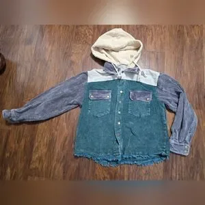 Unique green, gray, and cream colors! Corduroy material with cotton type hood.