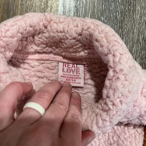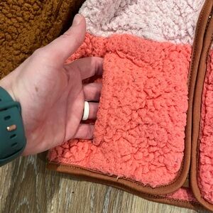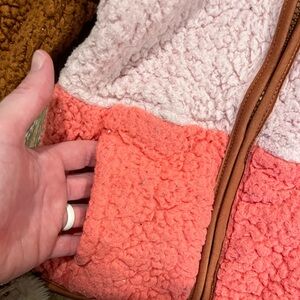 Cozy sherpa jacket with colorblock design. Features pink, orange, and brown sections. Perfect for chilly days.