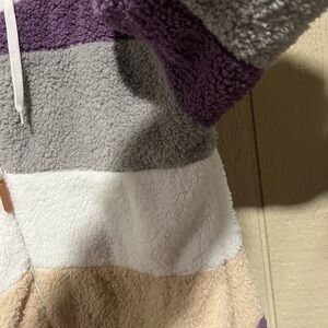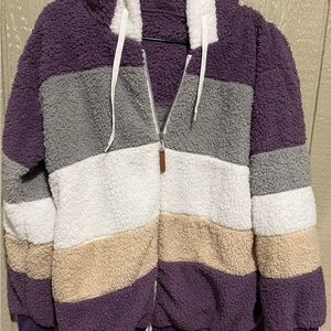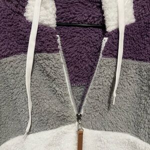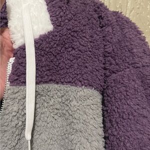 Cozy sherpa jacket with a colorblock design. Features a zip-up front and hood with drawstrings. Perfect for chilly days. Pretty jacket for Spring. No damage and recently washed in Gain. It is ready to wear.