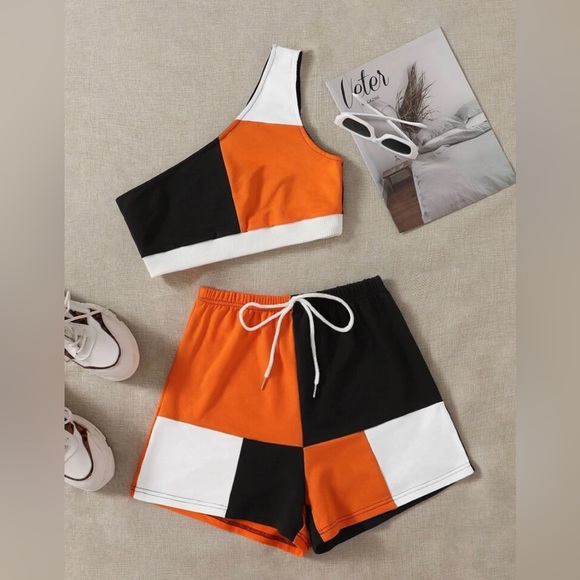 Orange, black, and white colorblock shorts set. True to size. Tie string in the front. May be worn as high waist. Only tried on once.