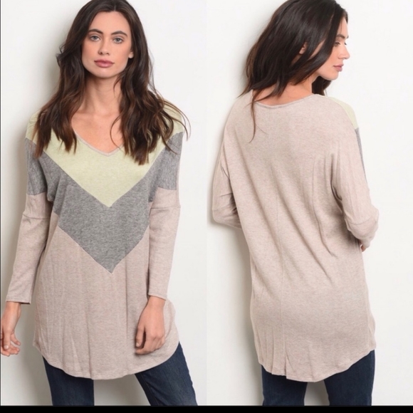 This gorgeous colorblock sweater is so super soft. It is made of 55%rayon, 28% polyester, and 22% nylon. This sweater has a subtle v neck. Last picture is upclose of color.