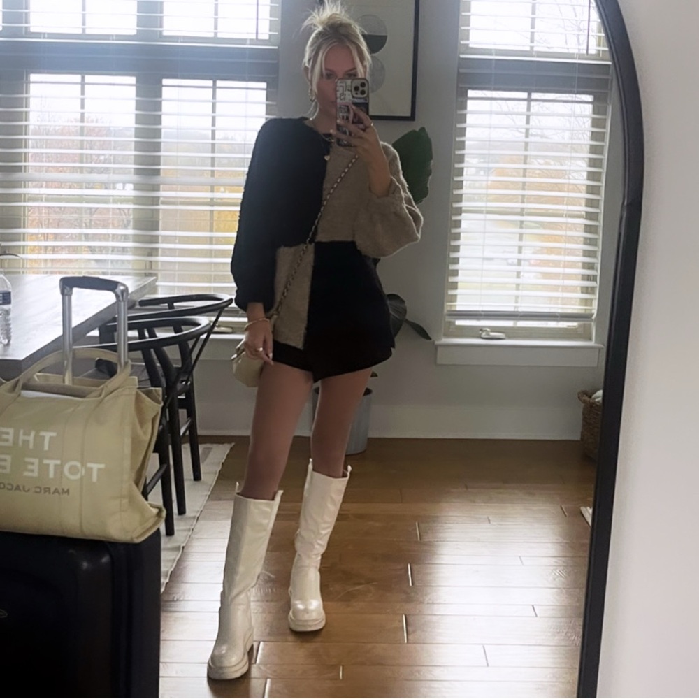 Stylish colorblock sweater dress paired with chic white boots. Perfect for a trendy look.
