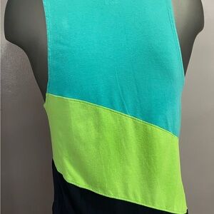 Vibrant colorblock tank top featuring teal, lime, and black hues. Perfect for a casual day out.