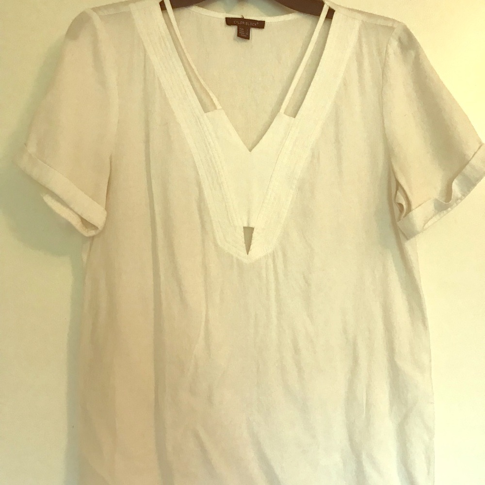 Very cute and light material! Has cut outs at the top. Shirt feels very well made and nice. True white. Perfect condition. Barely worn and washed maybe once. Looks great with a bralette or bandeau. Size is large but I wore it like a small or medium with a looser fit.
