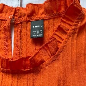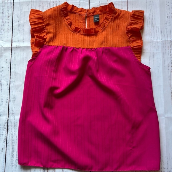 Bright pink and orange color block ruffle detail dressy tank. Small pull in right front- not noticeable when wearing. Price reflects. GUC from nonsmoking home.