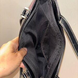 Stylish and versatile colorblock tote bag featuring black, brown, and red panels. Perfect for any occasion.