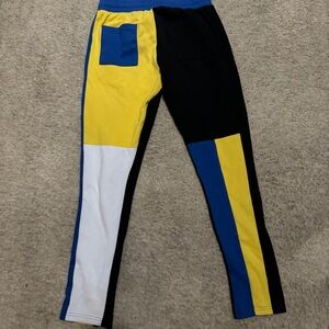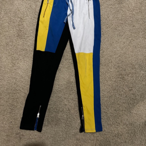 Stylish colorblock track pants. Features blue, yellow, and black panels. Zipper details on the legs.