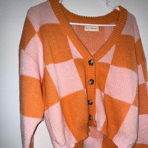 Stay cozy and stylish with this colorblock V-neck sweater. Featuring a vibrant orange and pink design, this sweater is perfect for adding a pop of color to your wardrobe. The button-up front adds a classic touch.