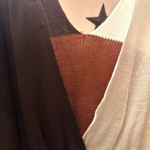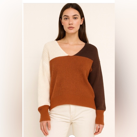 Stay cozy and stylish with this colorblock V-neck sweater. Featuring a blend of cream, brown, and tan hues, it's perfect for any casual outing.