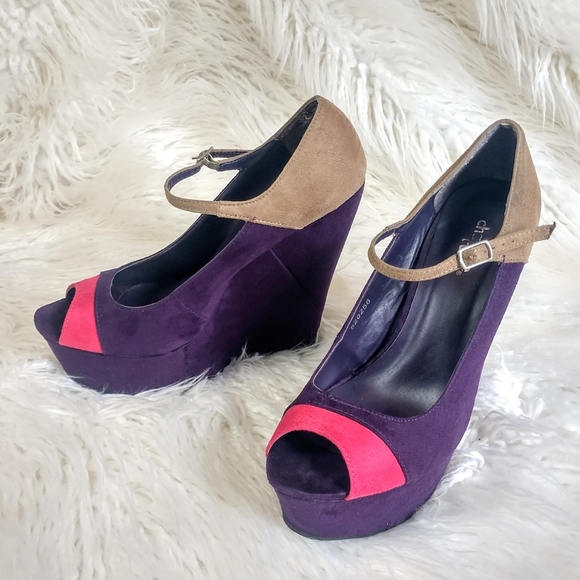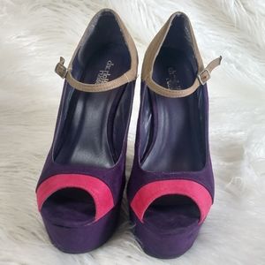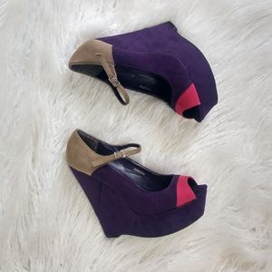 Wedges with buckle ankle strap. Suede like material with colorblock pattern. Good used condition. Has some glue marks on the inside of the right shoe heel as shown in last picture.