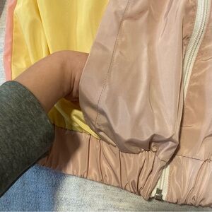 Stay stylish and comfortable with this colorblock hooded jacket. The pale pink, yellow, brown, and white remind me of an ice cream sundae. Small tears on one side shown in 2nd picture. Short length, may fit better for a modern S/XS