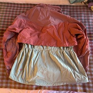 Stylish colorblock windbreaker jacket. Features a mix of light blue and mauve colors. Perfect for casual outings.