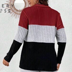 Stylish and comfortable, this colorblock ribbed knit set features a chic combination of gray, black, and red. Perfect for casual outings or lounging at home.
