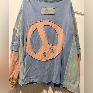 Stylish colorblock women's top featuring a blend of blue, green, and peach tones. Gently worn once