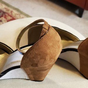 Neutral color palette, black/off white/tan, suede finish, almond toe, 5" high heel elevation, with generous ankle strap. Never worn. I can't walk in heels this high. Size 10 M