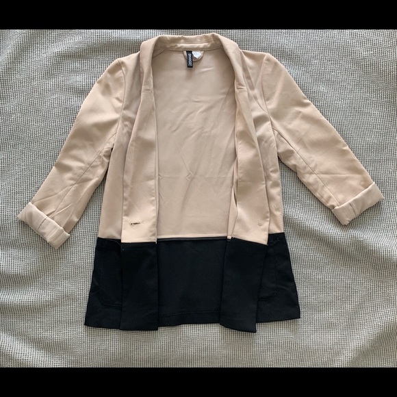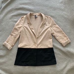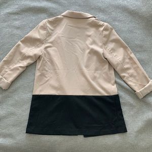 Colorblock blazer. Nude pink on top and black on bottom half. Bottom half has two front pockets. Blazer has a button closure in front. Excellent condition.