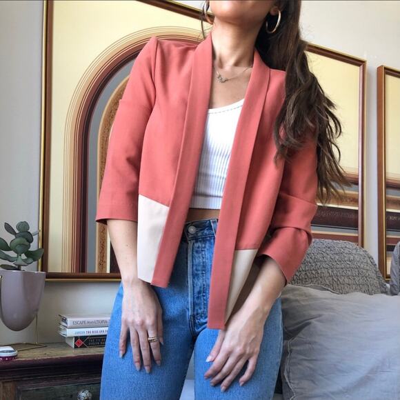 DETAIL: peach orange and cream/tan colorblock blazer jacket with single shawl lapel and no closure. Shoulder pads. Contemporary, work, professional, cute