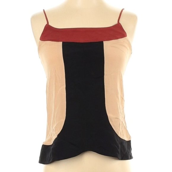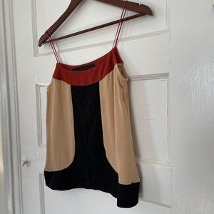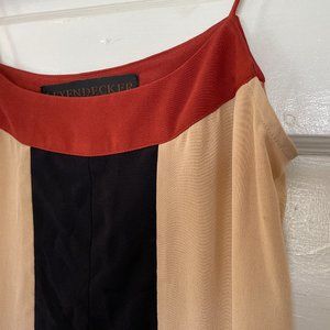 Great flowy camisole from Leyendecker Los Angeles. Top band straps are a vibrant rust color, along with creme and black. 100% silk. 30.5" Chest, 21.25" Length.