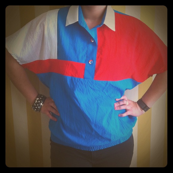 Cool buttons, white collar, batwing sleeves, red white and blue, windbreaker material, gathered waistband. All of that.