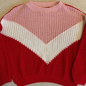 100% rayon, chunky-knit sweater. V cute, but I only wore it once for Valentine’s Day. Style with leggings or high waisted jeans!