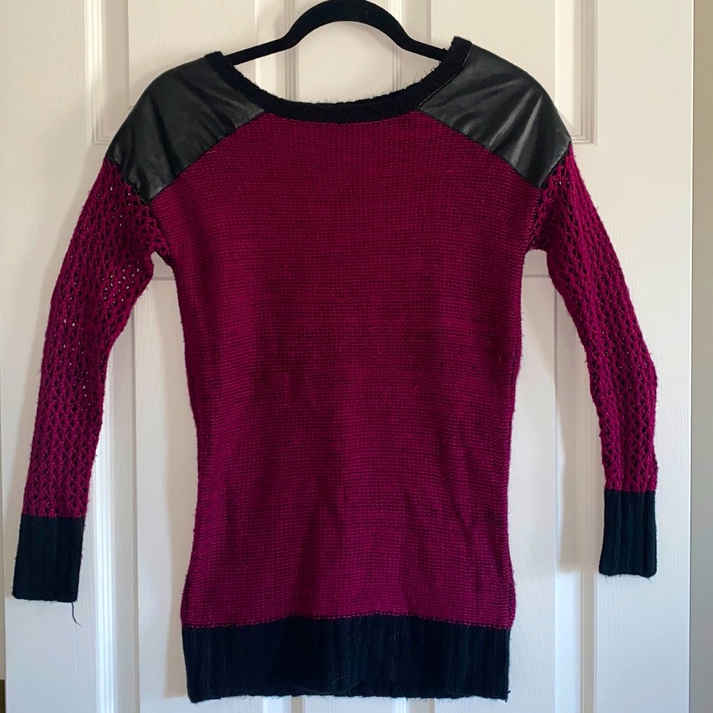Leather on the shoulder with fishnet stitching for the sleeves. Easy night out sweater