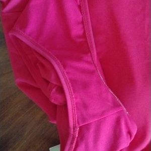 Junior red and fuchsia one piece color block swimsuit, peek a boo cutout detail, square neck, halter tie back, and removable bra cups. Removed protective liner, brand new never worn.
