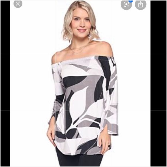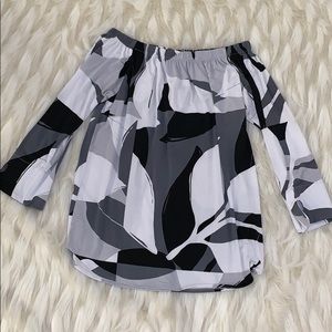 Gorgeous black, gray and white colorblock blouse. Can be worn off the shoulders. Sleeves have small detailed slits. Brand new. Size small.