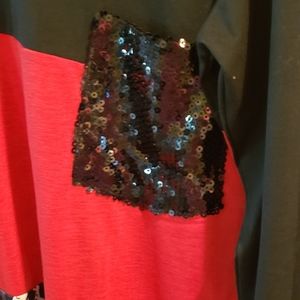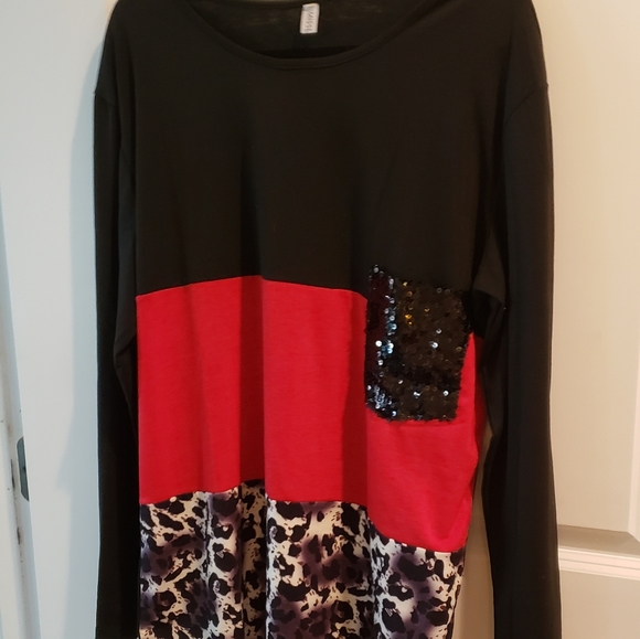 Women's colorblock tunic. Black, red, and animal print with black sequenced chest pocket.