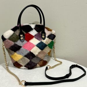 One of a kind! This colorblock satchel bag is handmade from patchwork textured & dyed genuine mink fur, with leather handles. Both sides are uniquely beautiful, includes a leather l with chain strap (high quality Coach strap), can match different outfits. Spacious enough for your phone, wallet, cosmetics, compact umbrella, credit cards, keys & other items This colorful satchel bag is perfect for casual wear or a gift for an important someone.