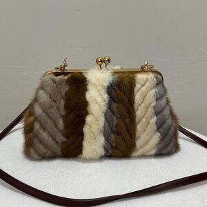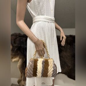 Only one available. This colorblock fur purse is handmade from genuine dyed mink fur stripe stitched, with vintage style metal frame. Includes 1 chain and 1 leather strap, can match different outfits. Use in multiple ways, hand carry, wristlet, crossbody or as an evening bag. Inside spacious enough for your phone, cosmetics, sunglasses, credit cards, keys and other items. This gorgeous fur purse is perfect for casual wear, evening out or a gift for an important someone.