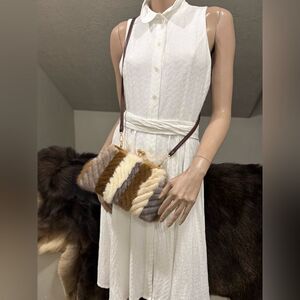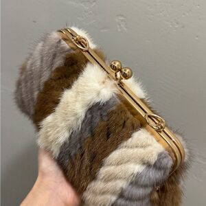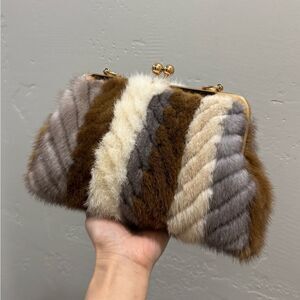 Only one available. This colorblock fur purse is handmade from genuine dyed mink fur stripe stitched, with vintage style metal frame. Includes 1 chain and 1 leather strap, can match different outfits. Use in multiple ways, hand carry, wristlet, crossbody or as an evening bag. Inside spacious enough for your phone, cosmetics, sunglasses, credit cards, keys and other items. This gorgeous fur purse is perfect for casual wear, evening out or a gift for an important someone.