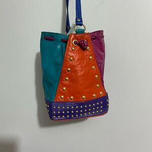 Colorblocked Studded Multi-Colored Leather Drawstring Bucket Bag